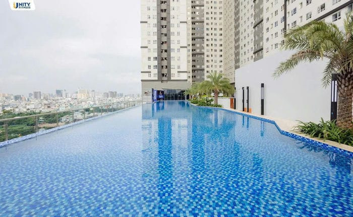 Đây là điểm tôi ưng nhất. Hồ bơi tràn bờ nằm trên tầng cao (tầng 6 của khối đế) có view nhìn về Bitexco và Landmark 81 cực đẹp.